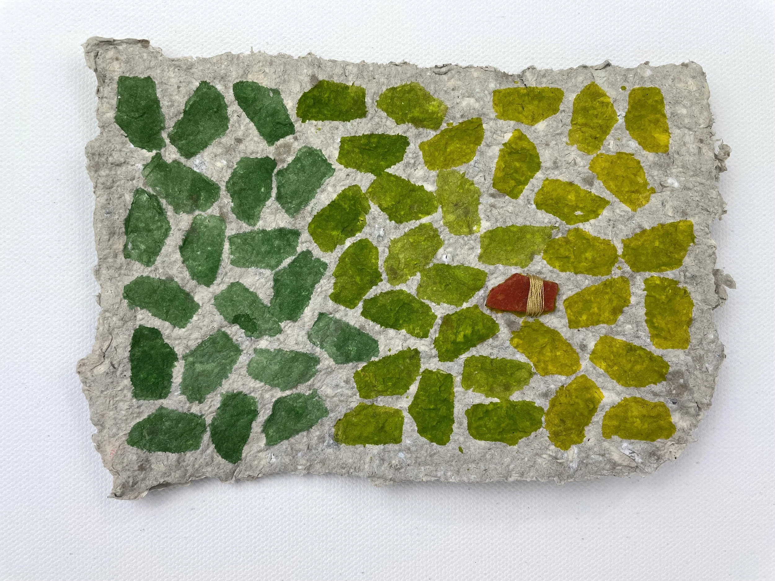 Shelby Silver, Behavioral Imprints, handmade paper, acrylic, plastic marine debris, and thread, 2022. Courtesy of the artist.